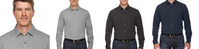 100% polyester mechanical stretch two-tone melange; 2.9 oz./yd2/97 gsm with moisture wicking performance; two-tone mélange fabric; hidden button-down collar; back yoke with side pleats; double-needle flat-felled side and underarm seams; tailored adjustable cuffs with buttoned sleeve plackets;